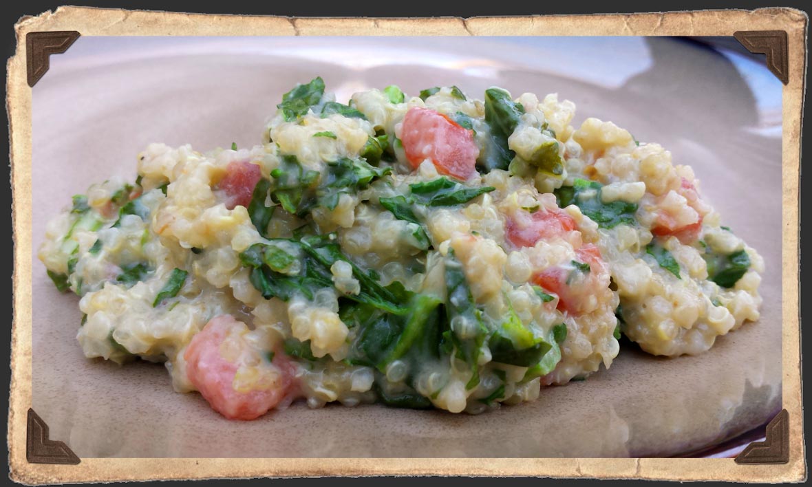 Another idea: Make a “risotto” using quinoa instead of arborio rice, folding in finely chopped broccoli rabe, diced tomatoes, grated Parmesan cheese. Let the heat from the quinoa and sauce mix wilt the rabe and sweat it down. The result is a flavor similar to horseradish from the rabe, combined with the creaminess of the Parmesan cheese and acid of the tomatoes. This pairs amazingly well with steak or lamb!