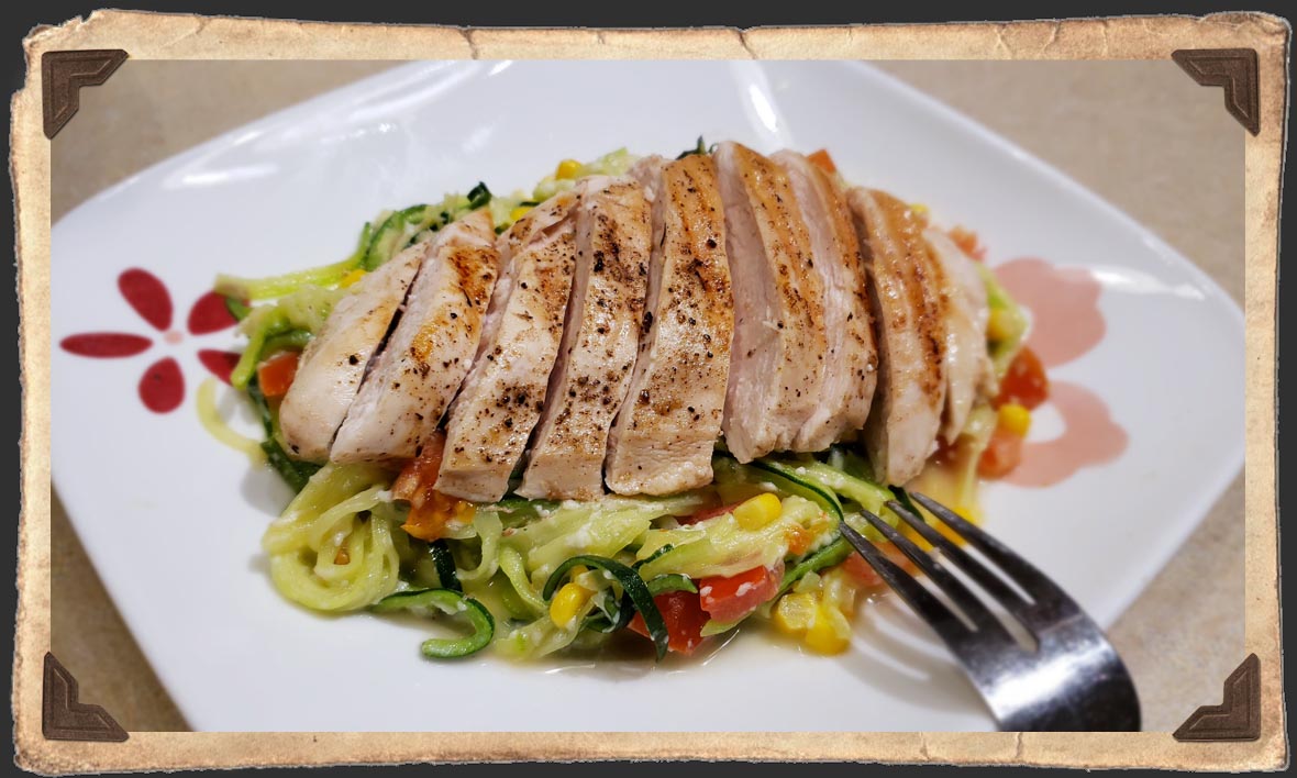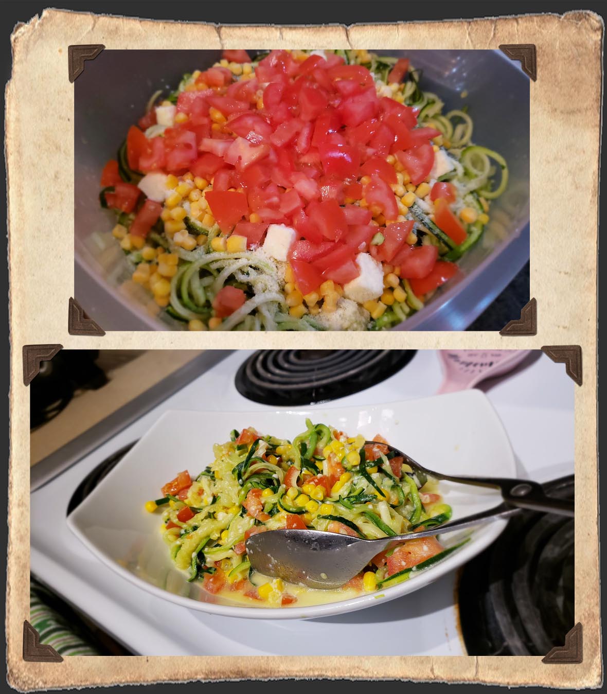 Layer zoodles, half of the butter, and 1/3 cup of the cheese. Next, layer tomatoes, corn, other half of butter, and remaining cheese. Add seasonings as desired. Cover lightly and microwave for about 5 minutes. Again, gently mix ingredients until the cheese and butter have created a sauce. It’s more of a faux alfredo, but it works with the lighter Summer fare. Top with your protein of choice. Honestly, it goes great with just about anything. Makes about 4-6 servings.