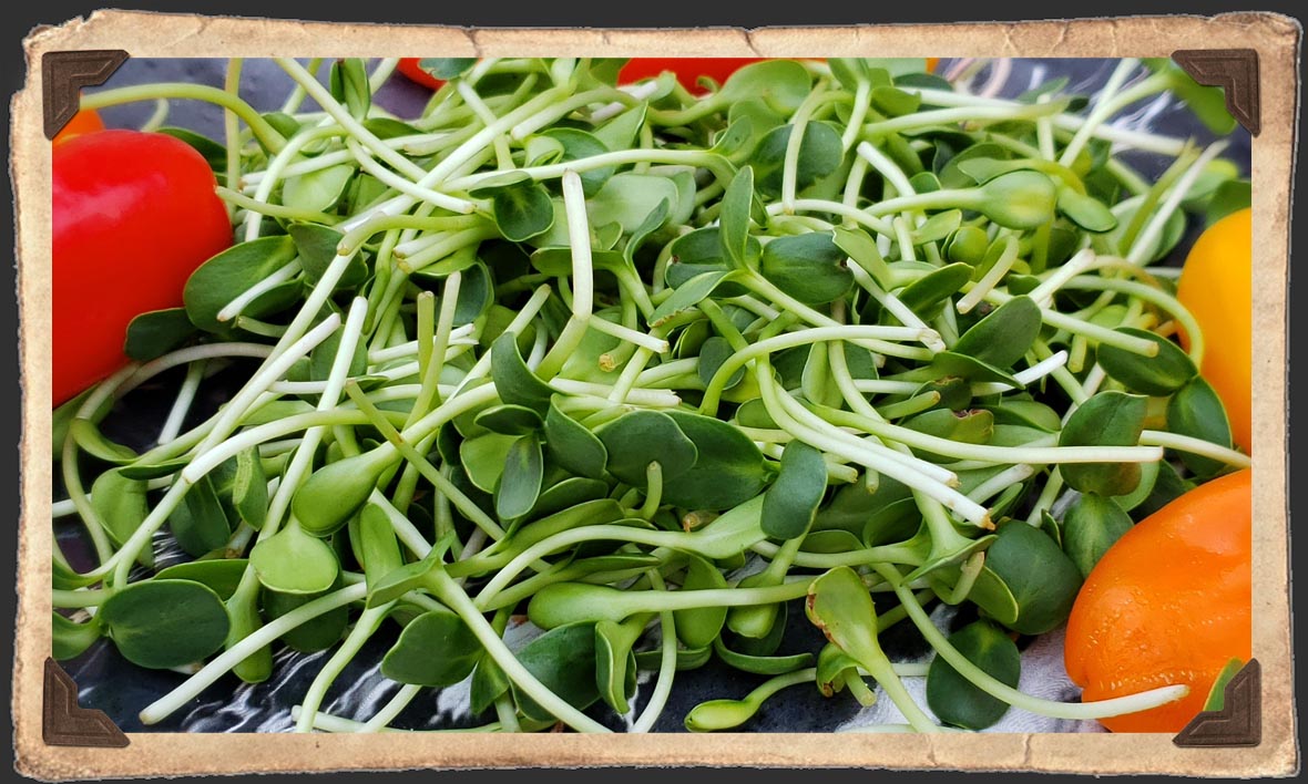A sunflower sprout is just that — it’s the very first sprout of a sunflower from its seed. Once they get big enough, they are cut from the seed or pulled along with the seed. I don’t mind the seed casings in mine, but The Man does not like them in his. If you get a batch with seed casings, you can usually put them in a colander and kind of shake them free to separate them from the sprout itself.