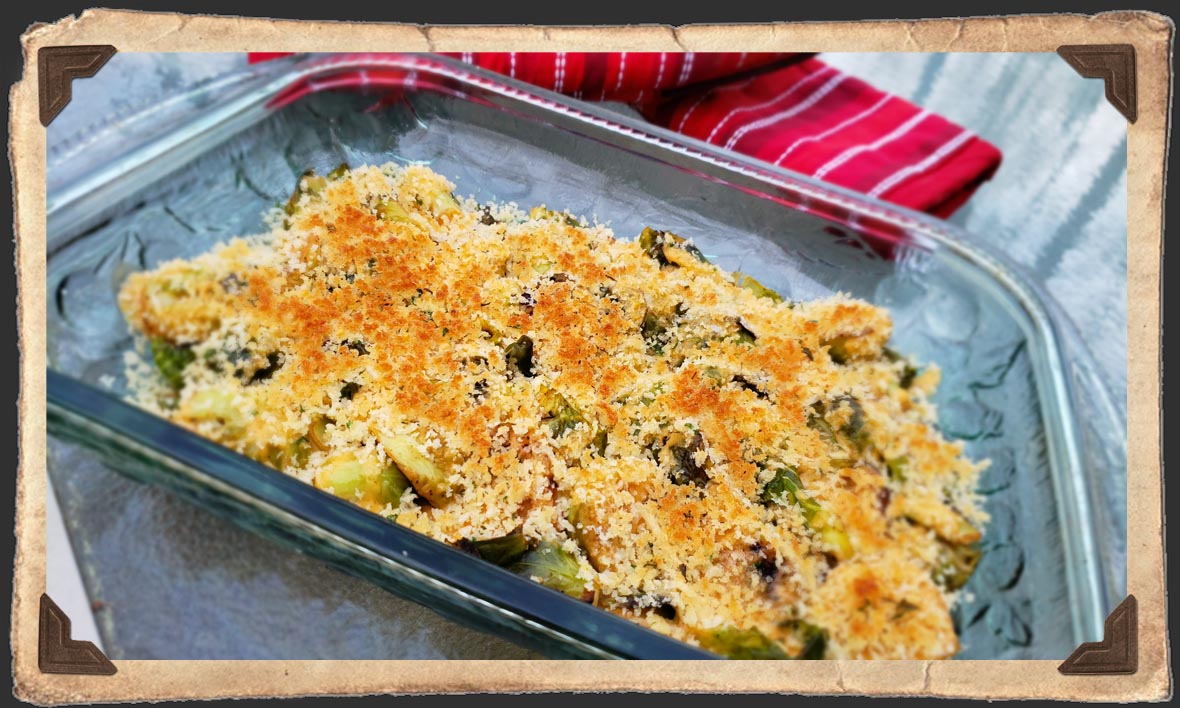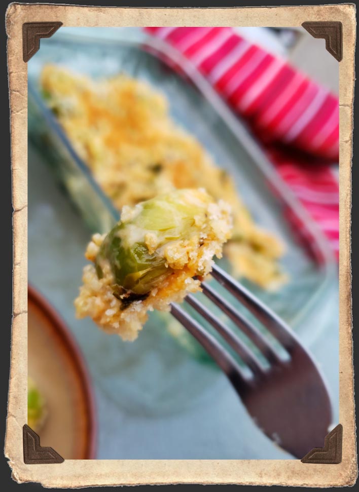 Once your Brussels sprouts are done, place them in a baking dish just large enough to spread them evenly across the bottom. Spoon enough cheese sauce over them so that each one is coated and there is some covering the bottom of the baking dish. Top with the au gratin topping and broil on low until golden brown.