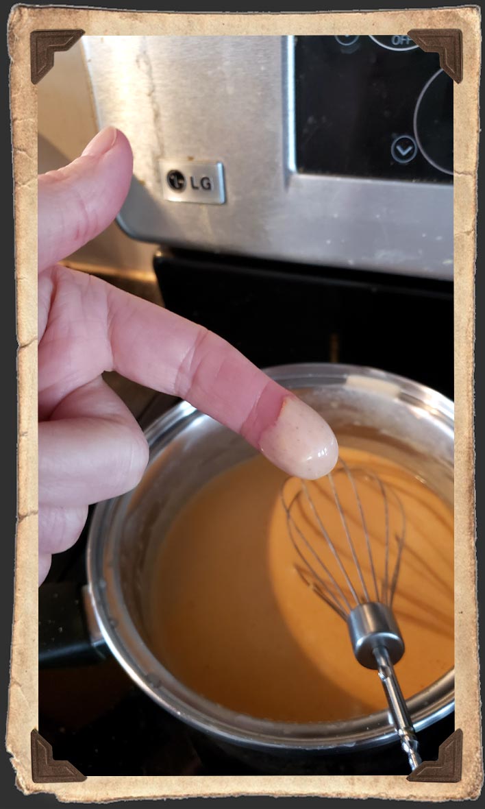Once I get my flour and butter whisked together, I start slowly adding in the milk and cheese until it looks the way I want it. It should be thick enough to coat your fingertip without being stringy from the cheese or so loose it runs down your finger.