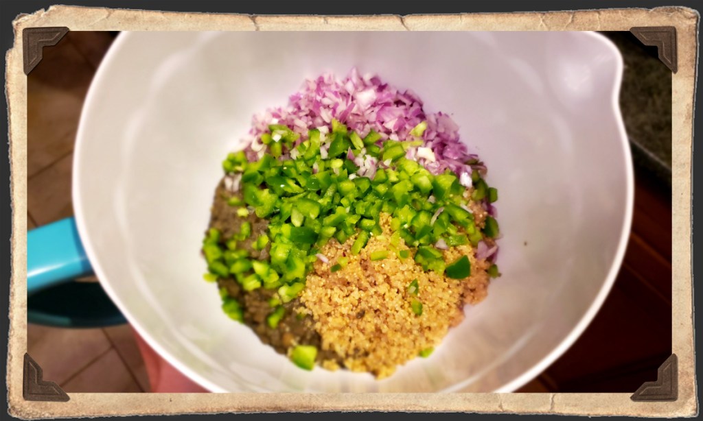 While lentils and quinoa are cooking, dice your peppers and onions, then prepare your BBQ sauce.