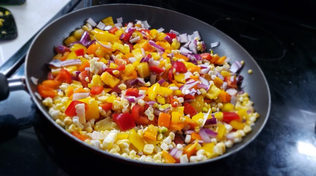 In a pan, heat about 2 tablespoons of the olive oil on medium heat. Add onions, corn, and peppers. Sauté until the peppers have a little charred look to them. Put the mix into a separate bowl and set aside.