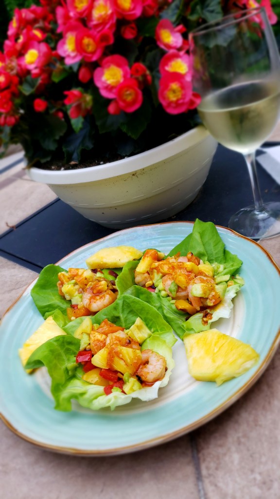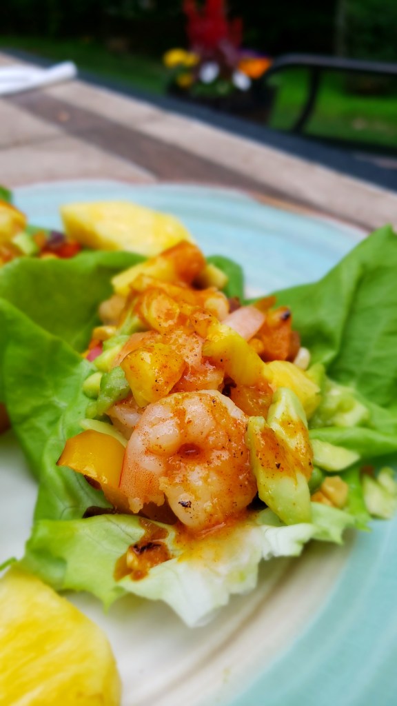 Detach the largest leaves from the bibb lettuce. Use two lettuce leaves to make one wrap shell. Fill the wrap with corn mix, then shrimp, then top with avocado and pineapple. Stir the sauce again to be sure all the spices are mixed in, then drizzle the sauce over the shrimp mixture.