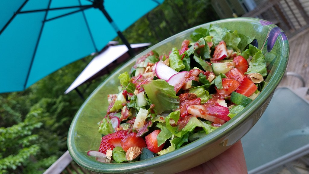 I put this on a fantastic salad made with the following goodies that go unexpectedly well together: