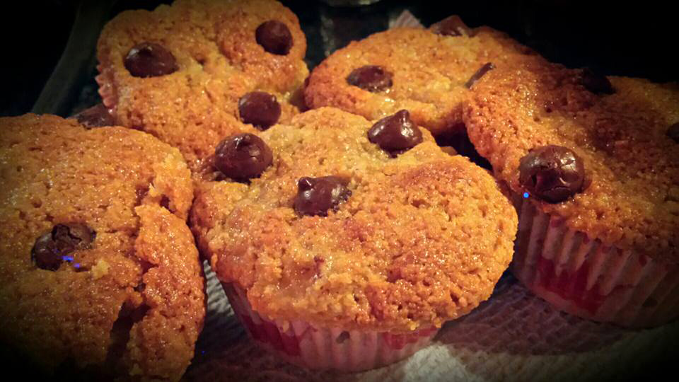 This batch makes 8-9 muffins. Don’t ask me why, haha. It just does. So I fill a muffin tin with 8 or 9 liners and fill liners ¾ full with mixture. Top with 3-5 chocolate chips, or as desired. Put a little water in the other spots to evenly distribute the heat during bake time.