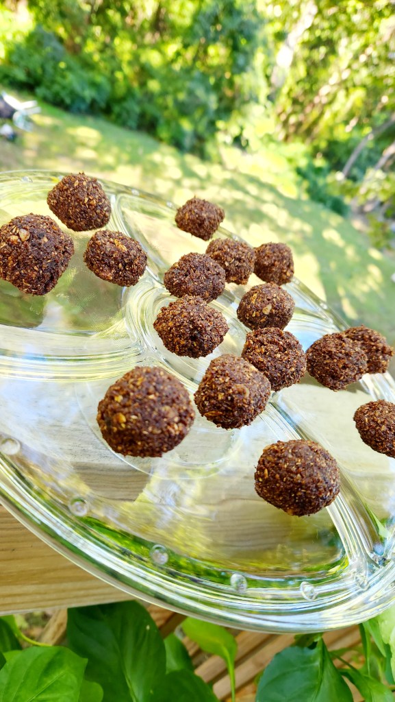 Combine all ingredients in a food processor, scraping the sides as needed, until fully blended together. Shape into 1” balls and refrigerate for at least 30 minutes. Makes 26-30 Energy Bombs.