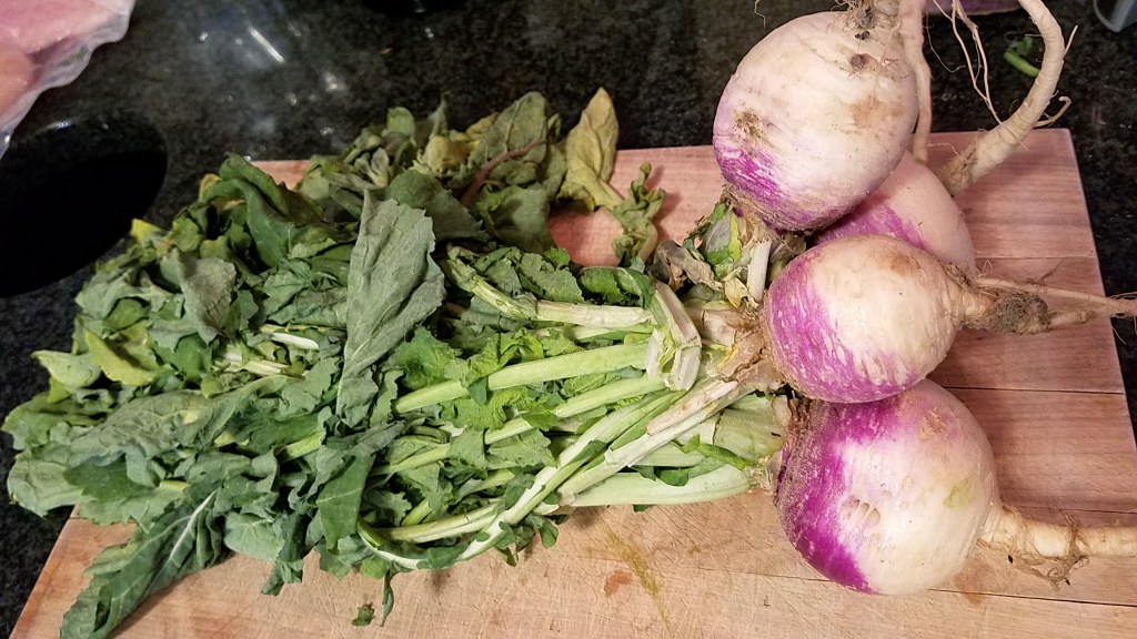 Cut the greens off of the turnip roots. Set aside for later. Peel the turnips, then dice. In a pot of salted water, boil the turnips until soft. Drain, then return to pot. Add butter, cheese, and seasonings. With a potato masher or large fork, smash the turnips until well blended and mostly smooth. There will still be some smaller chunks, but that’s okay.
