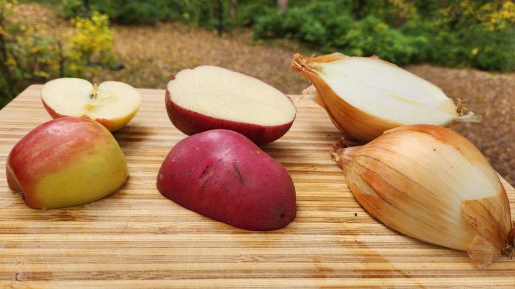 Dice onions and unpeeled apples and potatoes and boil in salted water until tender. Drain and combine with butter and salt back in the pot. Smash together until fully blended.