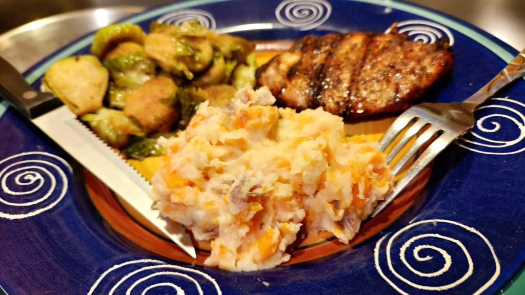 Dice onions and unpeeled potatoes and carrots and boil in salted water until tender. Drain and combine with butter, milk, and seasonings back in the pot. Smash together until fully blended.