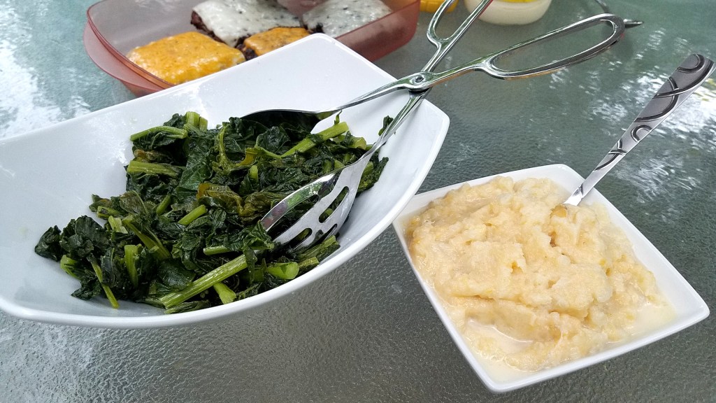 In a sauté pan, heat olive oil. Rinse and rough chop the turnip green leaves 1-2 inches from the root end. Throw away those last pieces. With the remaining greens, you can trim the stems away or leave them intact; it’s up to you. Sauté with salt, pepper, garlic and onion powders until soft. If the greens get too dry and hot, you can add a little water to the pan.