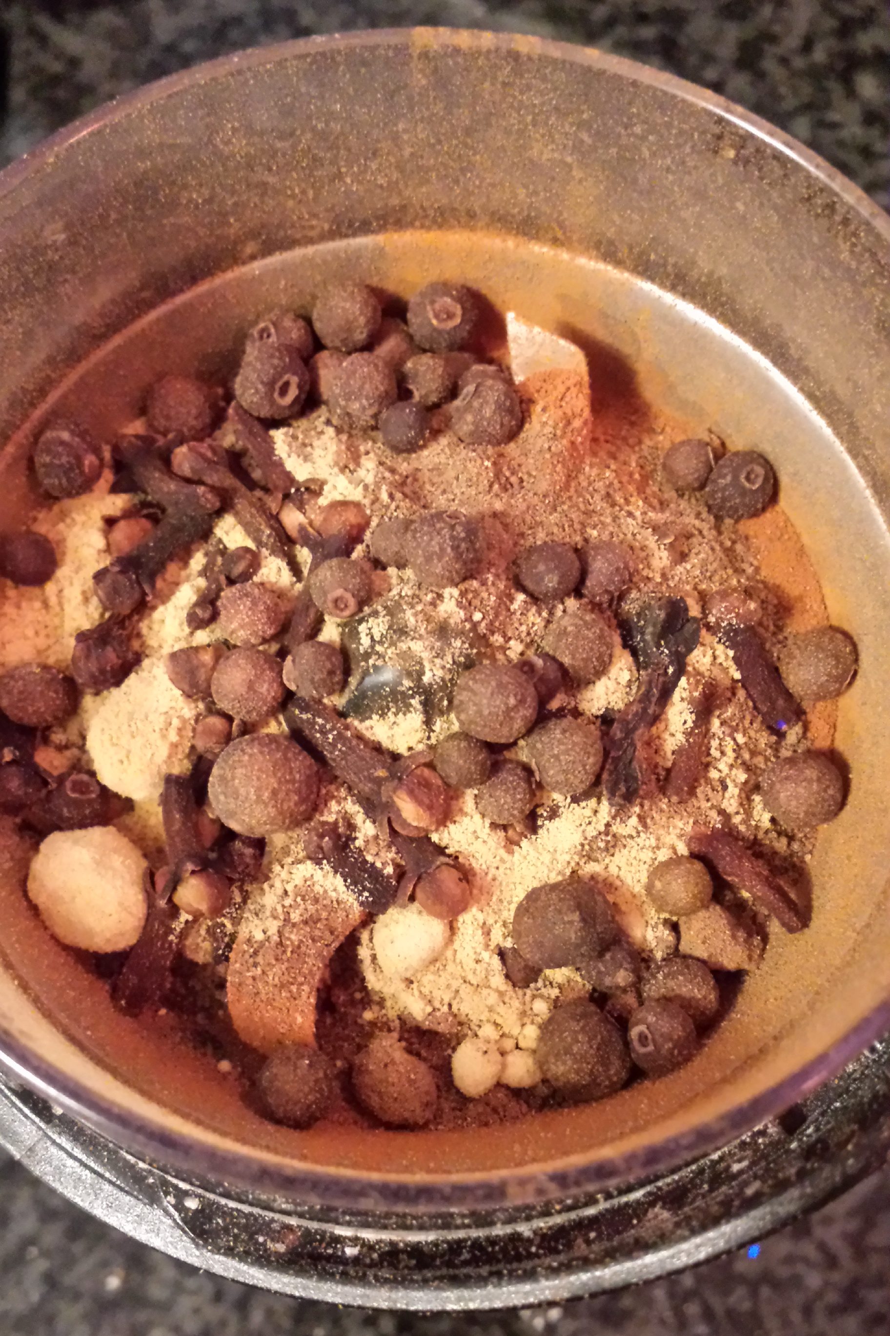 Grind until spices are processed as much as you can get them. When you’re done, take a small strainer and strain powder into a separate bowl. What’s left should just be small pieces. Take out any larger pieces (sometimes cloves leave behind stems). Anything else that didn’t strain through can be ground more in a mortar and pestle or with a meat tenderizer.