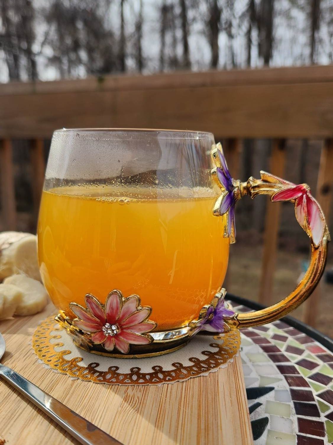 In a small pot or kettle, bring water to a boil. Peel ginger and slice thinly into 5-6 thin pieces. To peel, you can use a spoon to scrape off the skin without removing the flesh. Add ginger slices to hot water and let steep for 10-15 minutes. Add in all other ingredients and mix thoroughly before serving.