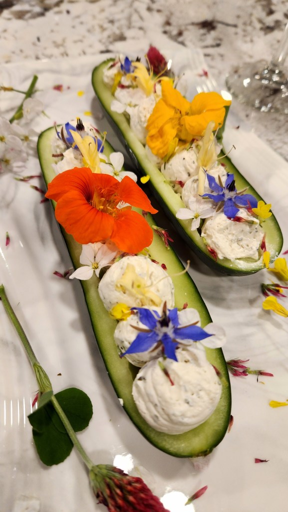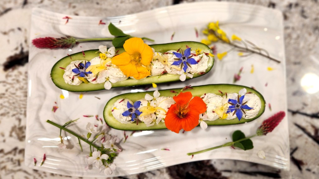 Scoop out about half of the inside of the cucumber. Whip the cream cheese so that it becomes fluffy (or get whipped cream cheese). Fill the cucumber with cream cheese and top with flowers of choice. The more flowers you get, the more creative you can become. Have fun with it and enjoy!