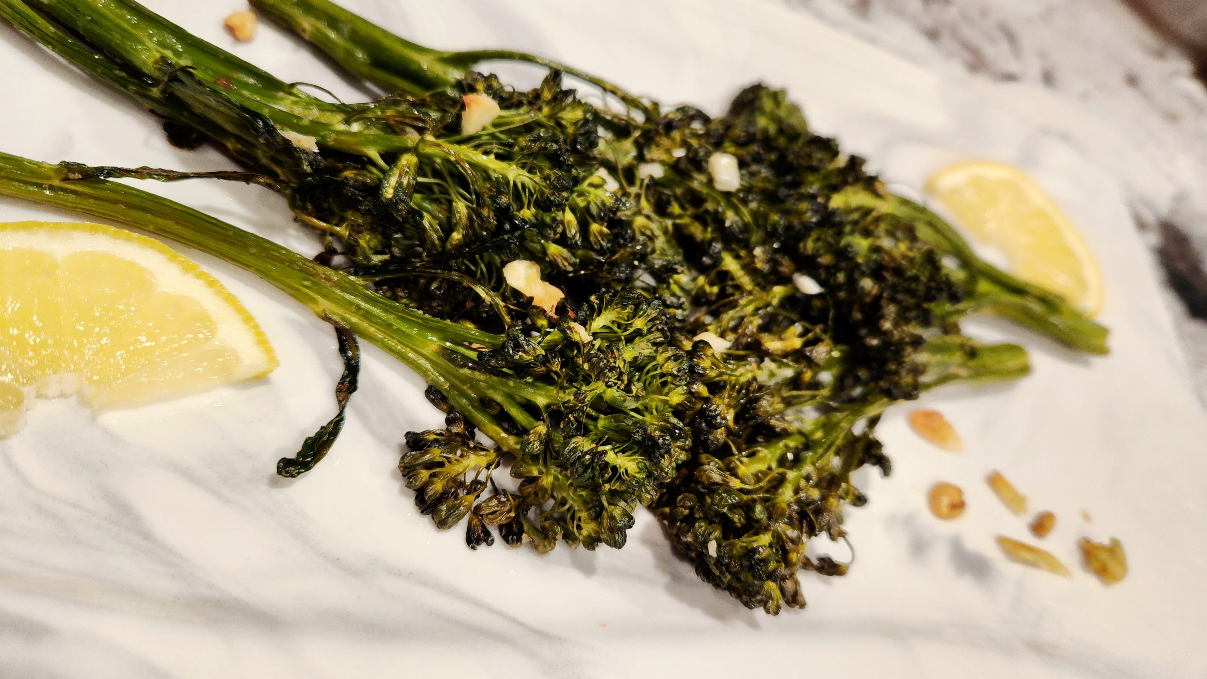 Preheat oven to 325°. Trim the bottom of the broccolini*, so that only about 2 inches of stem is left. Combine all ingredients into a large bowl and toss until broccolini is well coated. Spread evenly on a baking sheet – you may need to scrape out and top broccolini with the garlic. Bake for 20-25 minutes or until stems are tender**.