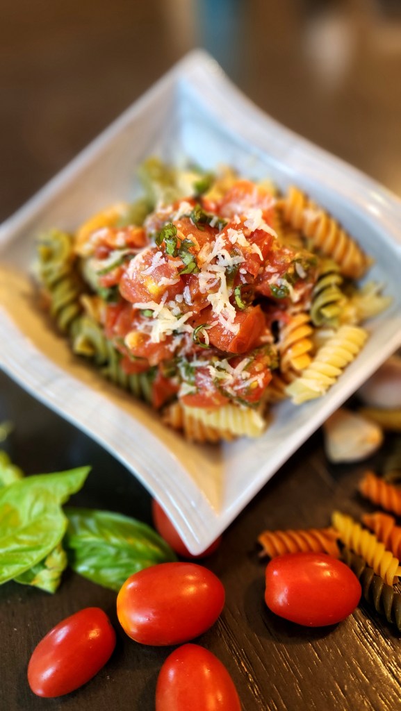 Mix tomatoes, garlic, olive oil, and vinegar (opt) in a bowl. Microwave all ingredients except the basil for about 2-3 minutes or until tomatoes have begun to break down. Add in the basil.